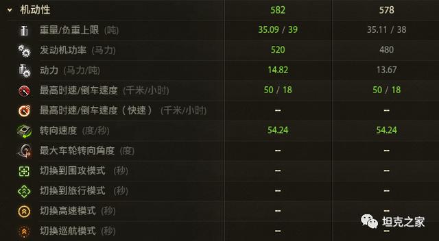 ①中规中矩的机动能力:极速50km/h,相比于同僚T-54的56km/h,可以说是差强人意;480马力(520马力)的发动机,13.67马力/吨(14.82马力/吨)的推重比,看起来似乎并没有什么比其他MT强势的机动能力?