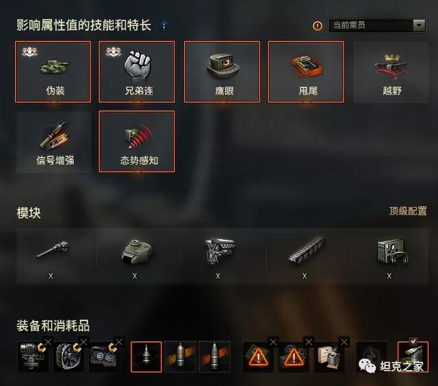 技能方面,个人推荐优先修理,然后“人肉双稳”的搭配。(炮手的人工稳定和驾驶员的平稳驾驶)