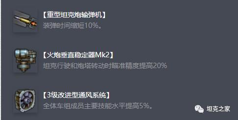 配件推荐输弹、垂稳、通风(高光),既能够最大化我们的伤害,也能够提高火控水平。(如果需要高视野可以将垂稳或通风更换成高光)