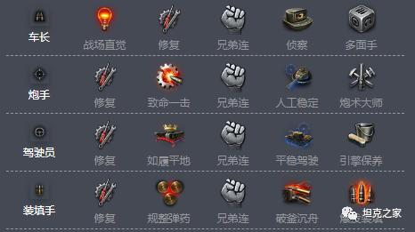 作为一线高机动“肌肉”重坦,技能上优先学习修理。其次在二技能或三技能学习兄弟连,进行全面属性提升。车长兼职通讯兵需要学习两个视野技能,炮手推荐致命一击和人工稳定,驾驶员则需要先学习如履平地和平稳驾驶、快速转弯等技能,担心着火的话可以学习引擎保养,装填手必备弹药规整和破釜沉舟。
