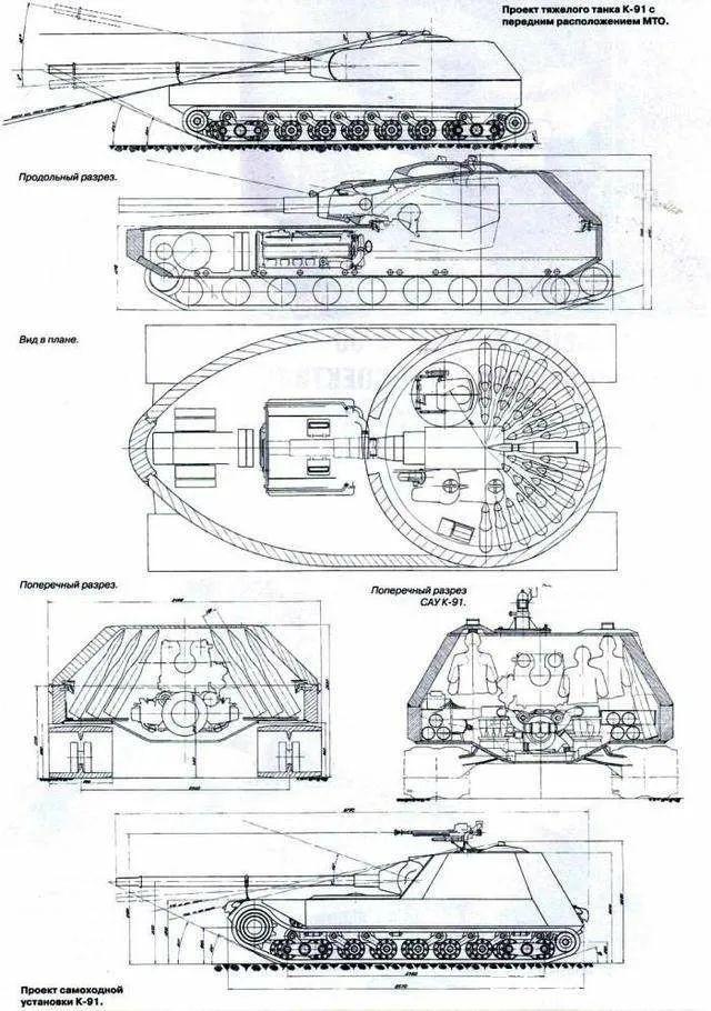 K-91是由苏联军工委员会下属的特殊设计局(OKB IK SV)进行的一项坦克研究计划。1949年3月起开始设计,在局长克拉夫采夫(A. F. Kravtsev)的监督下,共完成了3个设计方案的设计:2个重型坦克方案(炮塔后置的K-91-1型和炮塔中置的K-91-2型),以及1个坦克歼击车方案(K-91-3型)。
