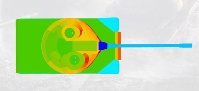 虽然车体正面装甲的数据乍一看很吓人,但是为了容纳其后的传动系统,倾斜角度并不大,平地正对时首上等效约为225mm,首下等效约为185mm。相比之下,不规则外形的炮塔防护要靠谱许多。除开两个头包外(当然等效也有200mm+),其余部分等效最少都在240mm,大部分地方超过了270mm。值得注意的是,宽大的履带大概占了车体正面的40%,无法卖头时用履带骗对手的炮弹或许是个不错的战术。