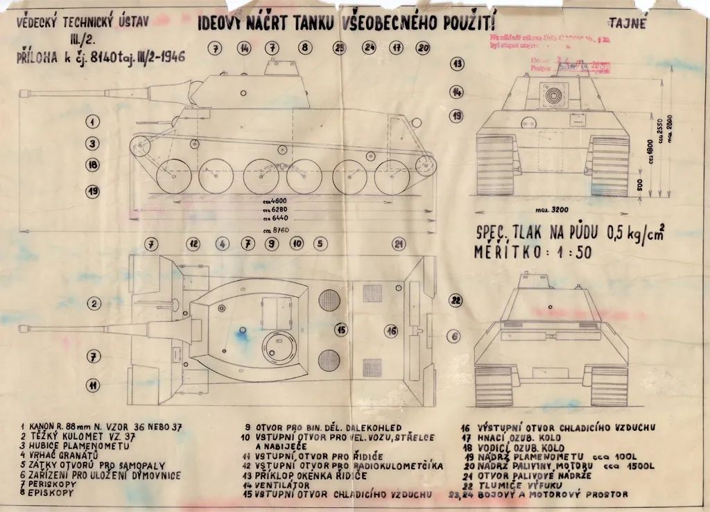 TVP是捷克语“Tank Všeobecného Použití ”,意思是“中型主战坦克”,这是捷克军方在1946年开始的一个项目,意在结合苏联、德国和捷克的坦克设计,自行研发一型国产坦克。但实际上主要还是德国和捷克的技术,这个方案后来扔给了斯柯达公司,斯柯达给它换上短88炮就成了6级金币车“斯柯达T40”。