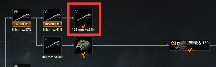吐槽归吐槽,还是回到TVP VTU这台车上来。它除了白板短88炮之外,共有3门升级炮可供选,其中一门100炮是在T-34-100时期就可以点出来的,而玩家完全可以不点TVP VTU这台车的专属长88和105炮。