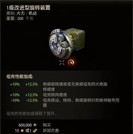 略鸡肋的配件,可以提升转向但是过剩,不如转动机制又加转速又加火控;速度保持的效果也不如涡轮增压器直接加功率来的更实在,定位略尴尬。