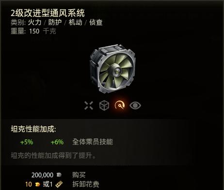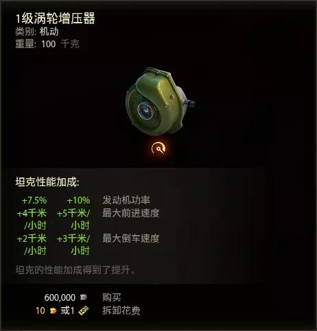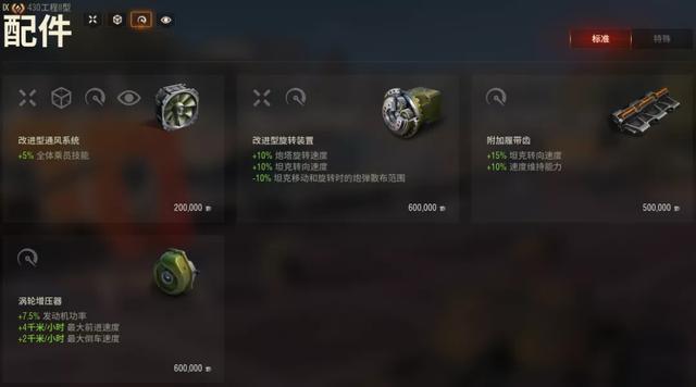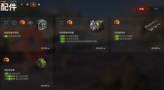 机动类配件有4个:旋转装置、附加履带齿、涡轮增压器、通风。